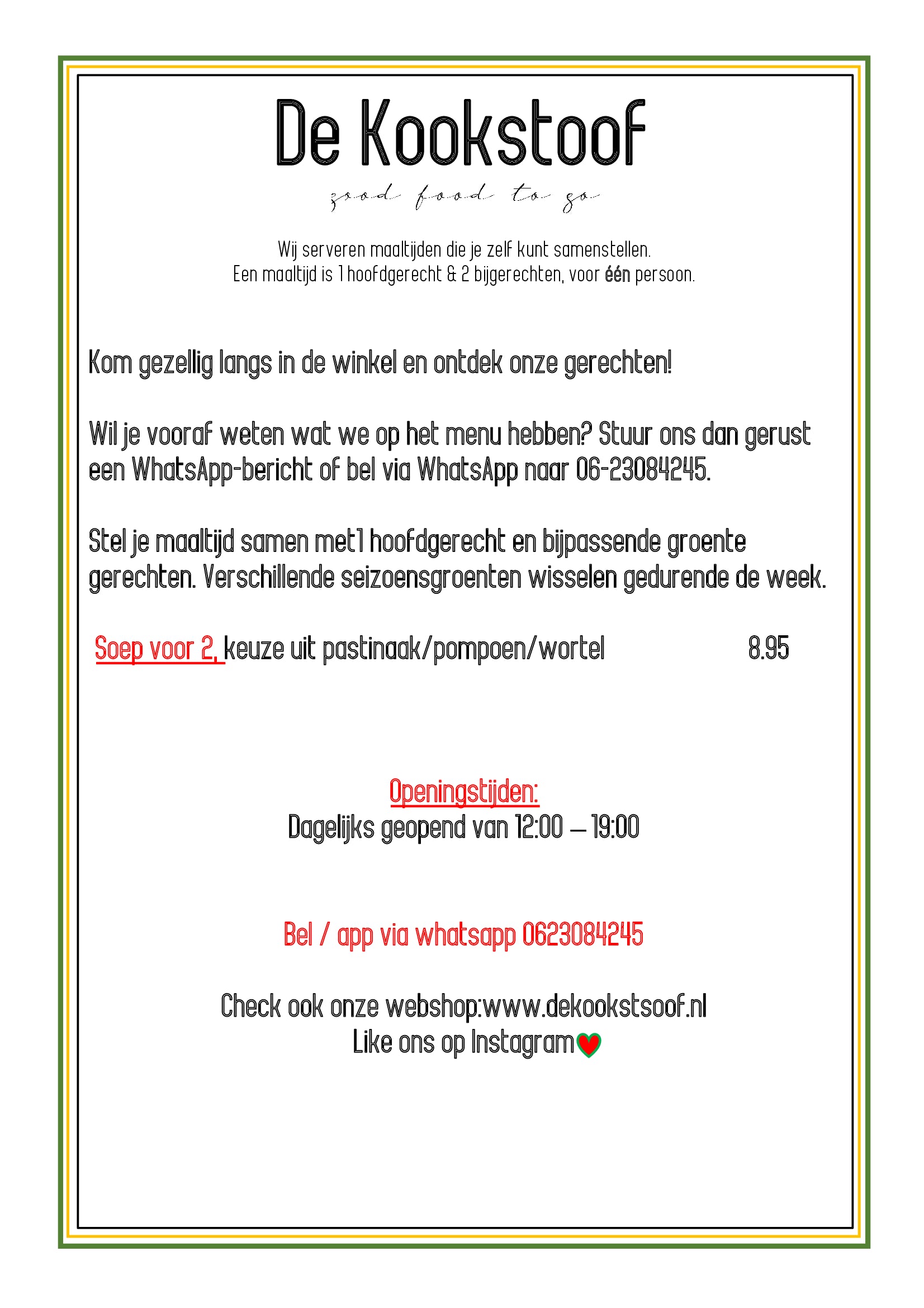 Daarnaast hebben wij veel wisselende groente gerechten en iets zoets voor na of bij de thee of koffie. Dus, hou je van gezond, vers maar vooral smaakvol eten en heb je geen zin of geen tijd om zelf te koken? Kom langs, wij hebben met aandacht en liefde voor je gekookt. Wij wensen iedereen een feestmaal toe!
