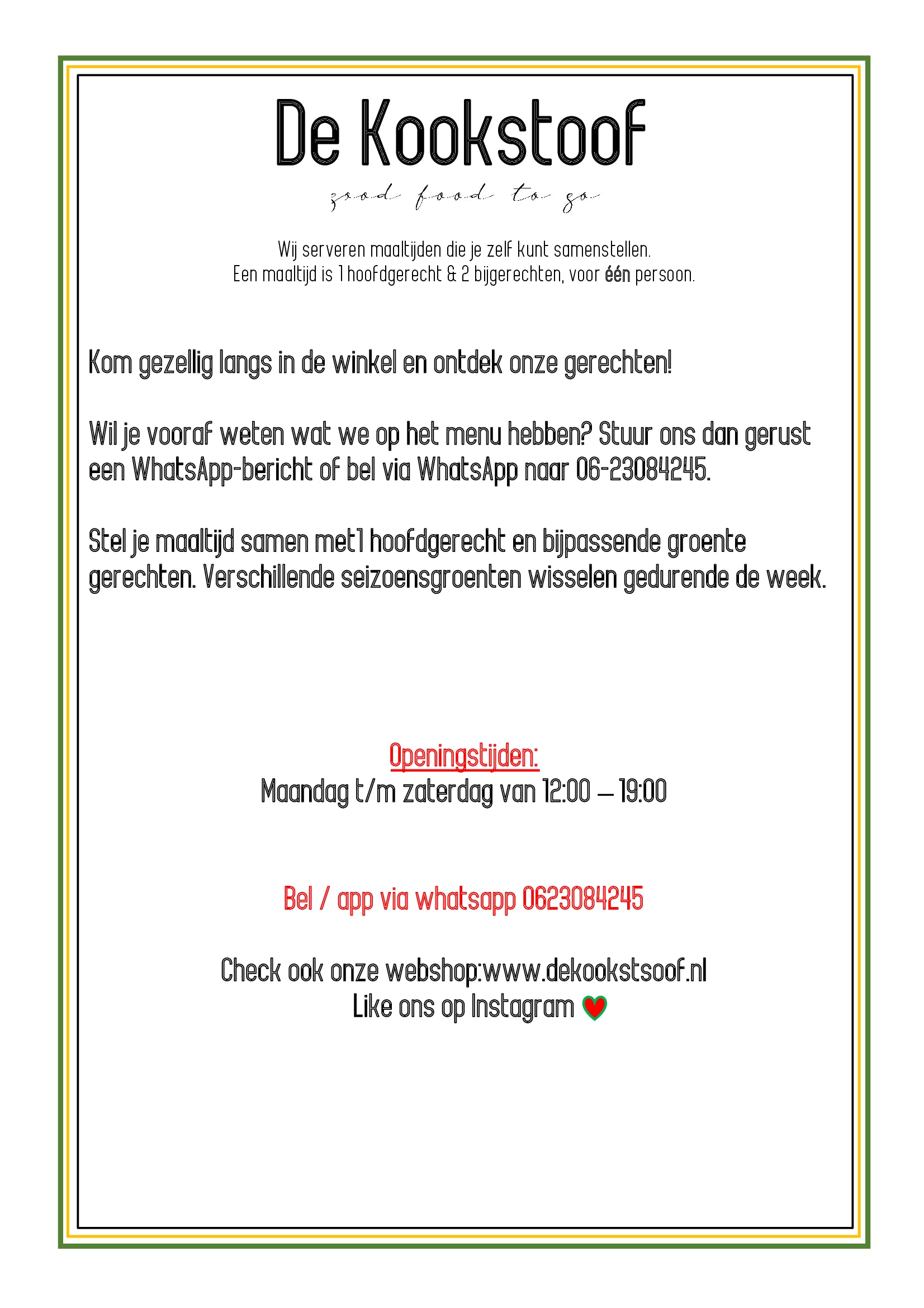 Wij bedenken, bereiden en verkopen verse en gezonde maaltijtden met een mediterrane twist. Deze hoef je thuis alleen maar op te warmen. Wij maken graag bijzondere gerechten, denk aan kip met citroen & rozemarijn, gehaktballetjes met ricotta en salie, geroosterde aubergines met saffraan yoghurt, salades, soepen enzomeer. Wij werken uitsluitend met regionale - en seizoensproducten. Elke week hebben wij een nieuw menu met een vlees, vis en vegetarisch hoofdgerecht.
